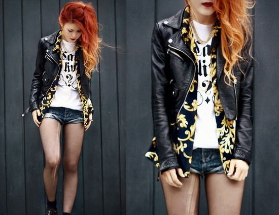 帥氣的黑色皮衣與酷味十足的黑色印花襯衣,時尚、前衛(wèi)。牛仔熱褲的搭配更是為造型添加了一份街頭感,破洞的絲襪透漏了濃濃的叛逆感。