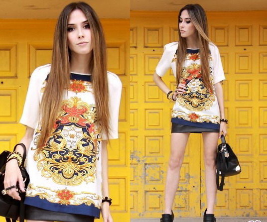 顏色亮麗的印花連身洋裝讓人眼前一亮,合身的收腰設計凸顯了纖細的腰部線條。復古的印花圖案襯衫帶著些許的奢華感,與白色熱褲的組合既呼應了襯衣袖口、領口的白色設計又加強了造型的時尚度。