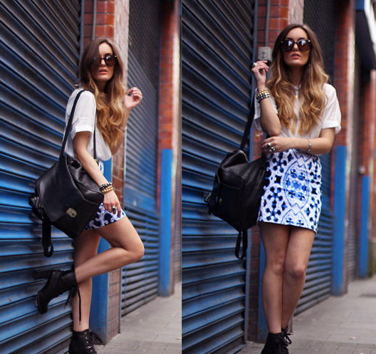 簡潔的白色襯衣與藍色系印花半身裙的搭配,大氣又不失俏皮感。黑色挎包與粗跟踝靴的組合相得益彰,加強了造型的整體感。