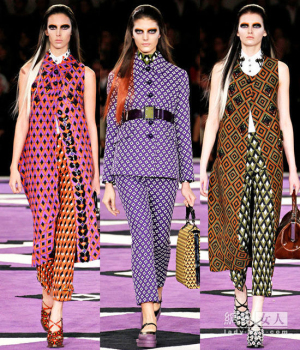 菱格印花圖案成為這一季的主題,2012秋冬Prada的印花風(fēng)格服裝可謂精致搭配到每個(gè)地方,反復(fù)的幾何印花,卻毫不繚亂,并不影響美感,從外套、長(zhǎng)褲到裙裝上都運(yùn)用了復(fù)雜的圖形撞色混搭,只有那些搭配功力高超的時(shí)裝精們才能輕松駕馭。