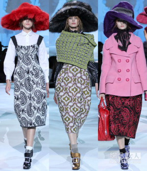2012秋冬MarcJacobs女裝靈感來(lái)自?xún)晌豁敿?jí)時(shí)裝評(píng)論家AnnaPiaggi和LynnYaeger,整個(gè)系列都與性感毫不相干甚至廓形上還十分累贅,不過(guò)豐富的佩里斯花紋在服裝上顯得尤為突出,戴上優(yōu)雅的皮草帽,在時(shí)尚與復(fù)古中達(dá)到完美的平衡。