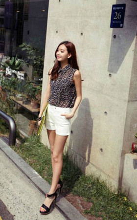 搭配Tips:半透視豹紋無袖襯衫+白色短褲
