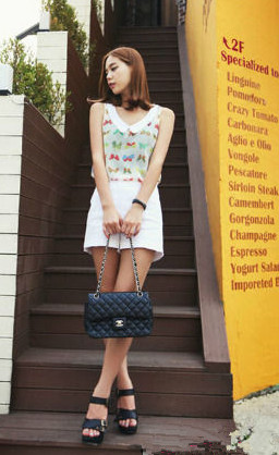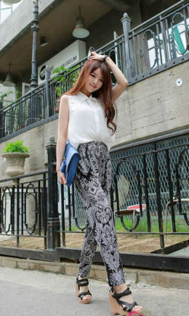 花紋圖案無袖襯衣和白色短褲的搭配是最經(jīng)典的基本款之一。這個(gè)可以copy,腰間蝴蝶