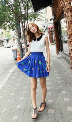 搭配Tips:彼得番領(lǐng)雪紡背心+寶藍(lán)色高腰印花半身裙