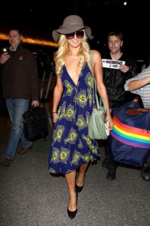 豪門(mén)名媛帕麗斯-希爾頓著寶藍(lán)度假風(fēng)清涼連身裙抵達(dá)機(jī)場(chǎng),背著綠色包包,黑色高跟鞋。$$分頁(yè)$$