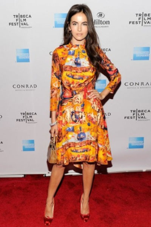 混血兒美女明星卡米拉-貝勒一襲黃色印花連衣裙搭配紅色高跟鞋,非常的美艷。