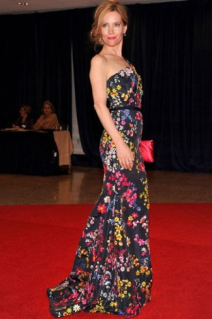 老牌女星Leslie Mann身著黑色碎花單肩連衣裙出席晚宴。$$分頁(yè)$$