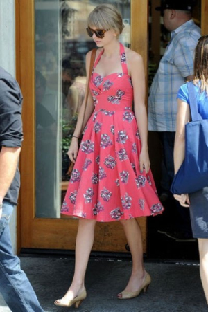 玫紅色掛脖印花連衣裙把鄉(xiāng)村歌曲小天后泰勒-斯威夫特(Taylor Swift)襯托的嬌媚動(dòng)人。