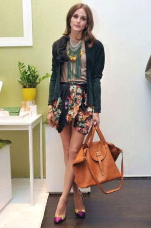 印花半裙,搭配大地色長(zhǎng)T、墨綠色開(kāi)衫,名媛奧利維亞-巴勒莫真的是混搭高手