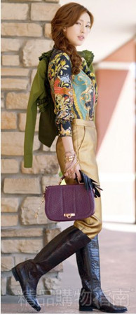 整套Look色調(diào)雅致質(zhì)樸,卻散發(fā)出迷人的貴族氣息。絲綢印花襯衫搭配金色長(zhǎng)褲,簡(jiǎn)潔中略帶華麗的宮廷感。巧妙地使用紫色手包、金色手鐲等配飾來(lái)進(jìn)行點(diǎn)綴,張揚(yáng)與內(nèi)斂并存。墨綠色外套融入軍裝元素是本季的流行趨勢(shì),閑暇的午后展現(xiàn)張儷最具個(gè)性的一面!