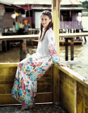 一字領(lǐng)波紋型上衣詮釋部落風(fēng)情,性感而野性,搭配印花長(zhǎng)裙,儼然一個(gè)美麗的部落少女。