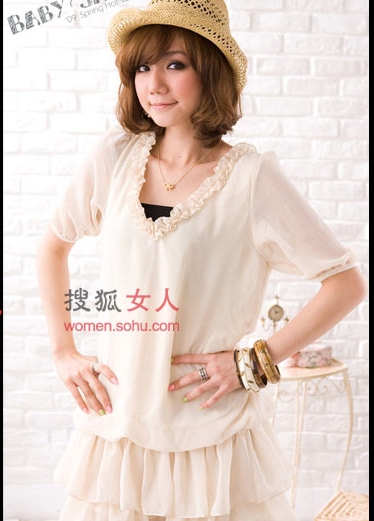 搭配建議:作為2009春夏季的潮流主打款,這款洋裝以雪紡作為材質(zhì),展現(xiàn)出女人淑女、柔美的一面;公主袖與荷葉滾邊領(lǐng)口的甜美設(shè)計(jì),為甜美度再次加分,無論是單穿或是內(nèi)搭都非常有型呢!