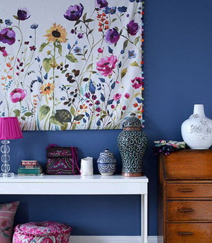 對于客廳的墻面裝飾來說,純凈的色彩是強(qiáng)調(diào)的重點。在白色麻布的畫稿上飾以簡單而強(qiáng)烈的花草圖案,這些色彩對比分明的紅色、綠色或紫色的花卉讓房間充滿生機(jī)。$$分頁$$