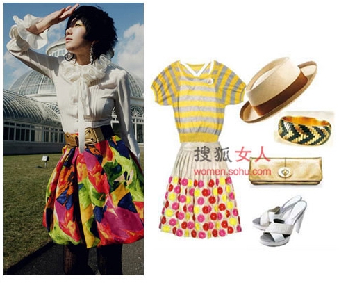時尚解析:簡單的純色背心搭配圖案繁復(fù)的花朵傘擺裙,將腰部收緊讓裙擺蓬開,塑造優(yōu)雅復(fù)古的淑女輪廓。