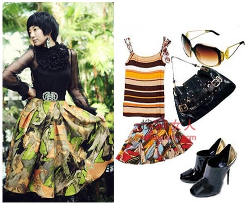 搭配建議:單看大花裙就給人感覺很甜美了,艷麗的的大花圖案令裙子甜美到了極點。并且線蕾絲的上裝一直很受年輕女孩喜愛。穩(wěn)重的腰帶及其他裝飾小物好看又實用,同時給整體搭配又添加了一道靚麗的色彩。