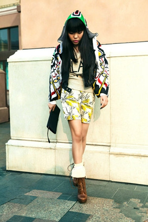 街拍中的吳莫愁鐘愛黑色,不過也加入一些跳色來應(yīng)景春天的氣息,像這款個性花紋連帽休閑外套,搭配鵝黃底色短褲,演繹小魔女獨有的酷感和俏皮的時尚味道。