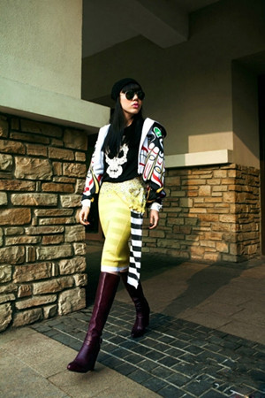 【集萃網(wǎng)觀察】個性圖案連帽休閑外套,選擇灰色衛(wèi)衣下穿個性花紋緊身褲和黑色坡跟中筒靴子來搭配,運動風(fēng)格,隨性大方。吳莫愁一貫的另類味道,墨鏡為這身搭配增色不少呢。