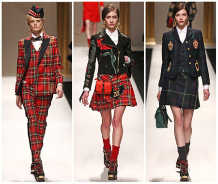 要說將蘇格蘭元素玩得最徹底的,那莫過于Moschino了。設(shè)計師以蘇格蘭馬術(shù)裝扮開場。