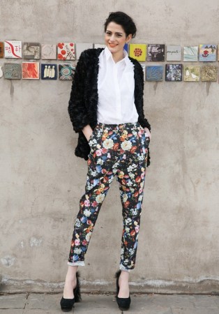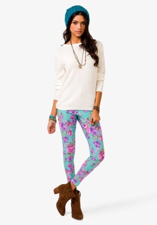 粉花紫花配綠底色對比鮮明,效果格外吸睛。小腳褲型搭配靴子十分有范。