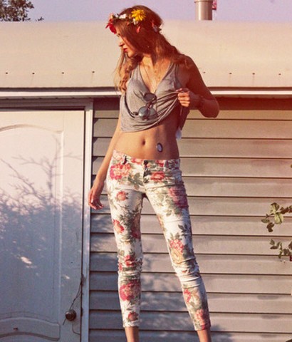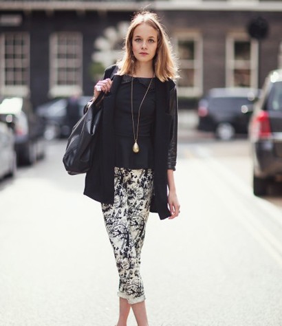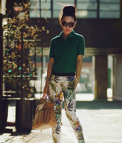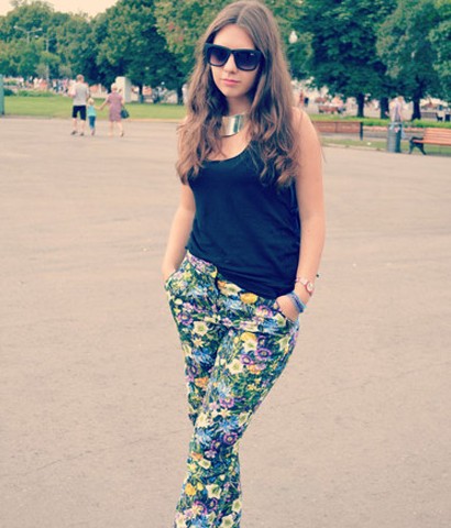 由于褲子上的花兒密密麻麻地相擁在一起,為不感覺更加突兀,搭配一件深色的上衣,便可展現(xiàn)縱身花叢的景象。