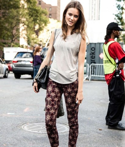 灰色的長背心,為不走光,便可搭配這一款深紫色的印花長褲;铎`活現(xiàn)的花朵,在褲子上盡情綻放。