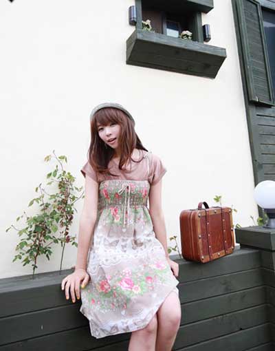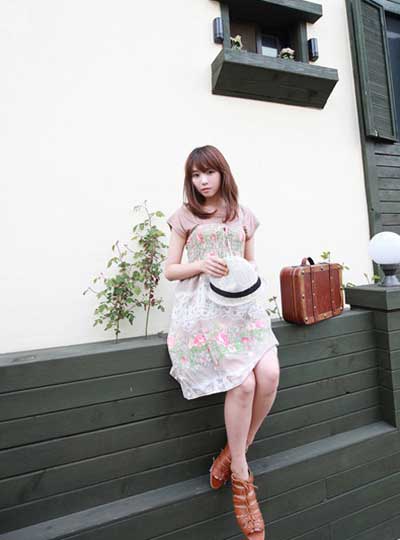 田園風的碎花吊帶短裙,內(nèi)搭粉色T恤,一頂清爽的白色草帽增加甜美度