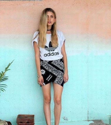運動風的T恤與幾何風格印花短裙搭配隨意,搭配黑色藍色拼接的厚底鞋,既甜美又不失率性。