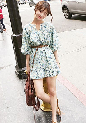 很有鄰家MM們氣質(zhì)的俏皮裝扮,大片印花很是浪漫優(yōu)雅,收腰的連衣裙更顯MM性感小蠻腰,簡約的平底涼鞋,自然曲卷的秀發(fā),很有小清新韓范兒。