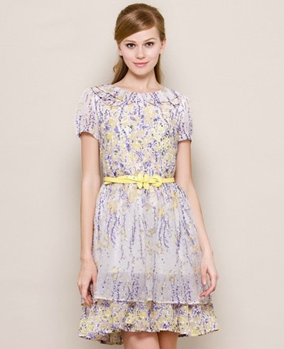 紫色和黃色本是一對(duì)冤家色,此款對(duì)撞皆用淡色,才顯得柔美動(dòng)人,不拘泥于紅與綠的俗套,令人想到美麗的薰衣草,陽光點(diǎn)點(diǎn),灑落期間,暈染的色彩迷離又層次豐富。圓領(lǐng)和荷葉下擺,也為整體提升了甜美和優(yōu)雅。$$分頁$$