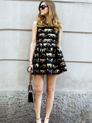 燙金牛圖案背心連衣裙 + 尖頭細(xì)跟高跟鞋 +小香風(fēng)菱格鏈子包 + 粗框墨鏡