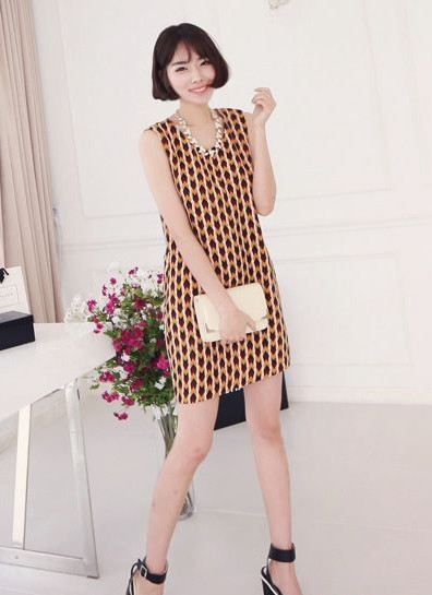 別具匠心的幾何圖形印花給人耳目一新的感覺,在視覺上產(chǎn)生顯瘦的效果。閃亮的項(xiàng)鏈增添貴氣。高跟鞋更是起到點(diǎn)睛的作用。