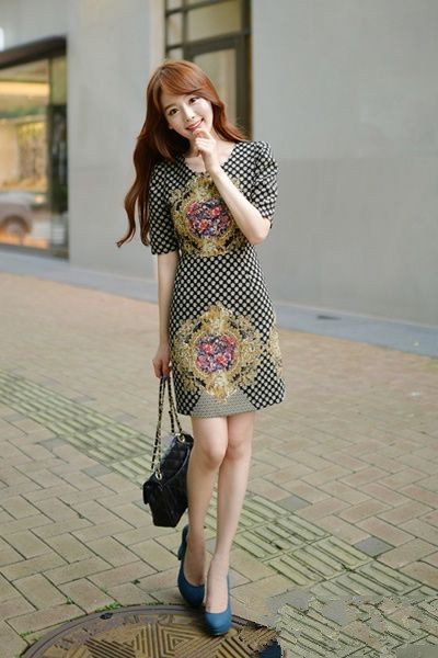 金色印花盡顯女王氣質(zhì),高貴端莊。高腰設(shè)計(jì)在視覺上有收緊腰部的效果,又能提高腰線。寶藍(lán)色高跟鞋為整體造型增添幾分俏皮可愛。