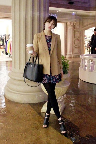 這款駝色的小西裝讓MM們看起來格外的小巧玲瓏呢修身的款式修飾MM們的身材,內搭上收腰的連衣裙,端莊中多了一份小女人的俏麗呢!