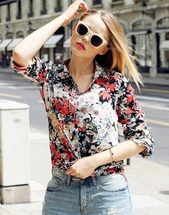 同樣是玄色的底衫搭配上繁復(fù)的花朵仿佛讓大家都忘記了這是件玄色底的衣服,搭配上一條破洞的牛仔短褲。輕松隨意中還帶著一點(diǎn)兒復(fù)古的味道,果凍色的墨鏡十分點(diǎn)睛。