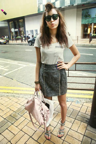 高腰圓擺印花短裙,與灰色基本款Tee搭配,低調(diào)時(shí)尚,造型的重點(diǎn)是——Tee的下擺一定要扎到裙腰里面。