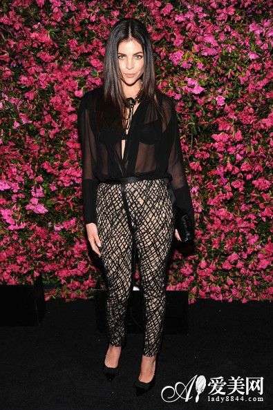 黑色透視長(zhǎng)袖上衣,下搭印花長(zhǎng)褲,黑色尖嘴高跟鞋,黑色小手拿包。