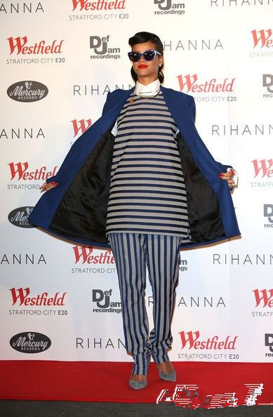 橫豎條紋印花的碰撞,橫條紋寬松上衣,豎條紋長(zhǎng)褲,整體視覺(jué)感十分強(qiáng)烈,尖嘴高跟鞋似乎已成了長(zhǎng)褲最有力的搭配之一。