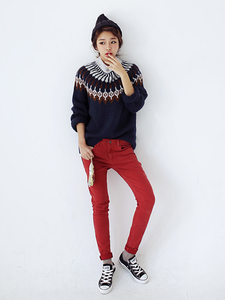 獨(dú)特配色設(shè)計的針織衫,圖案真的很好看也很特別,插肩袖的設(shè)計,不限肩寬,整體也不顯臃腫,下搭紅色修身小腳褲,展現(xiàn)了休閑的造型。