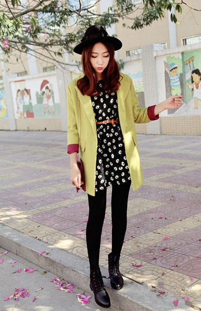 黑底白花的短款連衣裙,清新自然又永遠(yuǎn)不會(huì)過(guò)時(shí)的穿衣風(fēng)尚,腰帶什么的最能打造好身材,外面配一件黃綠色系的大衣,酒紅色的袖口和黑色蝴蝶結(jié)禮帽營(yíng)造復(fù)古感,黑色系帶皮鞋更是這個(gè)秋天的必備裝備哦!