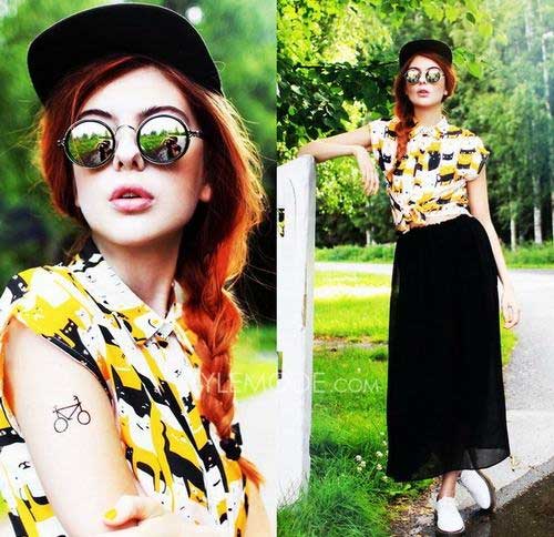 復(fù)古剪裁的印花襯衣為我們掀開了一份獨特的時尚印記感,腰間的系結(jié)設(shè)計更是勾勒出了纖細(xì)的腰線。高腰的黑色長款紗裙帶著略微的透視感,為裝扮增添了一份輕盈感。綁在一側(cè)的麻花辮十分契合整體的田園風(fēng)情,整體效果十足。