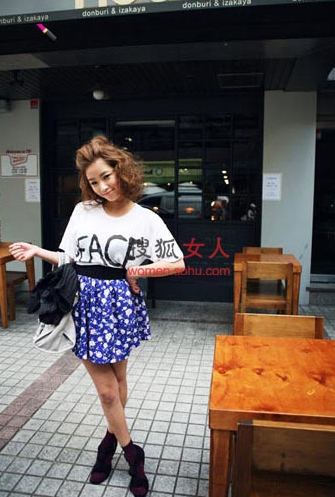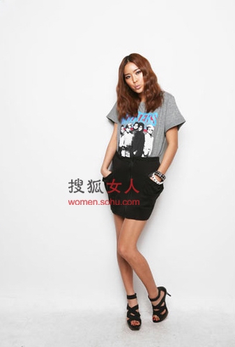 搭配建議:高腰圓擺印花短裙,與灰色基本款Tee搭配,低調(diào)時(shí)尚,造型的重點(diǎn)是--Tee的下擺一定要扎到裙腰里面。