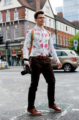 誰(shuí)說(shuō)雛菊印花只能穿在女士身上呢,酷潮的街頭男攝影師照樣hold,色彩濃烈的雛菊大印花搭配低調(diào)復(fù)古的棕色皮帶與皮鞋,弄潮兒就是你了。時(shí)尚不宜用力過(guò)猛全身只有一件點(diǎn)亮單品就夠了。