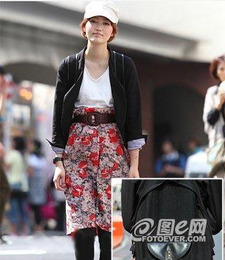 很有日本街頭時(shí)尚特色的搭配,簡(jiǎn)約舒適的白色Tee搭配復(fù)古感覺(jué)的紅色花朵印花高腰裙,搭配藝術(shù)氣息濃郁的黑色西裝外套(休閑寬松的款式是關(guān)鍵哦。,加以時(shí)尚感的藤編腰帶作為過(guò)渡裝飾,將老祖母的印花單品搭配出小資文藝調(diào)調(diào)。