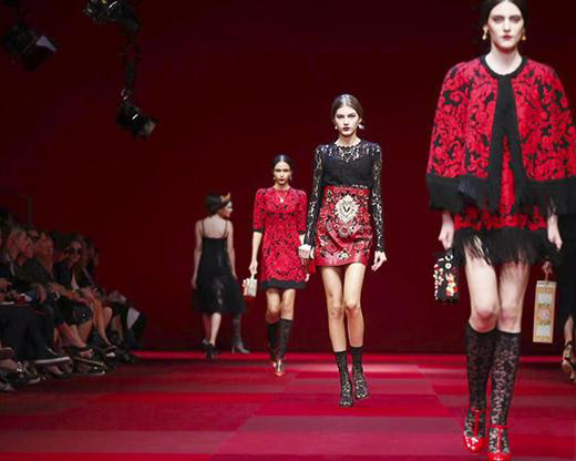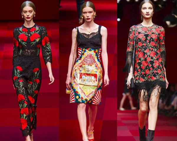 Dolce & Gabbana 2015春夏秀場的設計靈感源自于西班牙文化對西西里的影響。在Dolce & Gabbana 2015春夏的印花中,熱情、鮮紅的玫瑰與康乃馨繡在性感的黑色蕾絲裙上,搭配迷情的流蘇別樣的熱烈風情,這邊是西班牙與西西里風情女郎的風采。