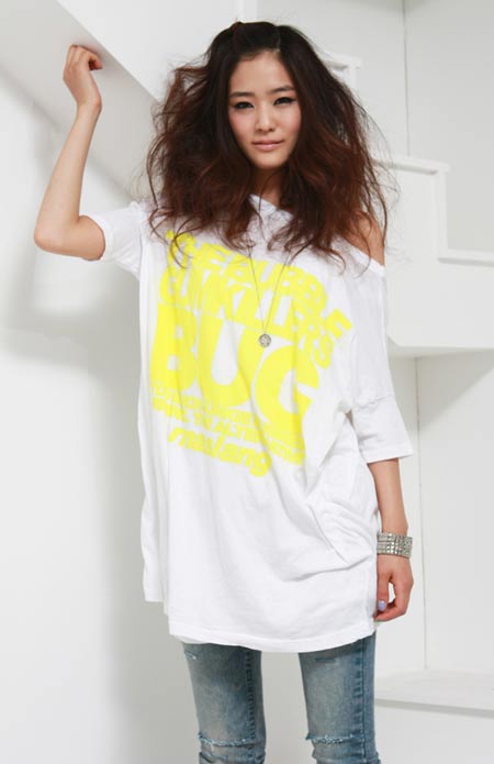 寬大潮T的時髦穿法一點要斜肩式穿著哦。