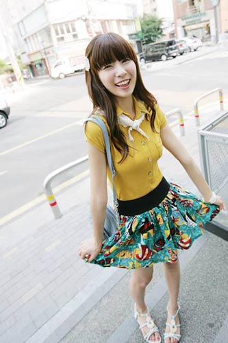 時尚穿衣打扮分析:芥末色polo領(lǐng)緊身T非常顯身形,搭配熱帶風情花卉短裙,做個夏日里的陽光女孩吧。