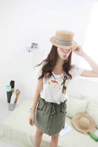 時尚穿衣打扮分析:可愛的童趣印花白色T恤,搭配軍綠色麻制工裝裙,怡然自在的外出裝。