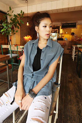 灰色寬T搭配黑色背心,毛邊牛仔褲露出修長的雙腿。