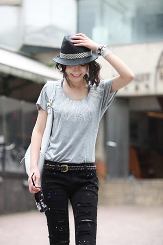 灰色短袖T搭配緊身黑色仔褲,再戴上一頂巴拿馬帽,帥氣十足。