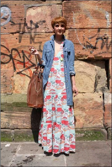 印花長裙搭配長款牛仔襯衫,民族韻味濃厚。